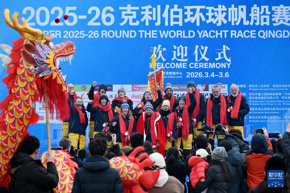 3月4日,舞狮队、舞龙队在青岛奥林匹克帆船中心码头表演,欢迎船队抵达。新华社记者 李紫恒 摄