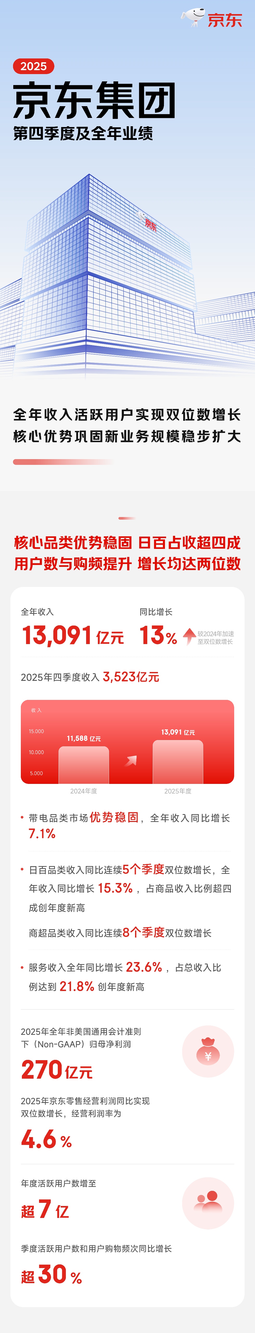 2025年全年非美国通用会计准则下(Non-GAAP)净利润270亿元;2025年京东零售经营利润同比实现双位数增长,经营利润率为4.6%。